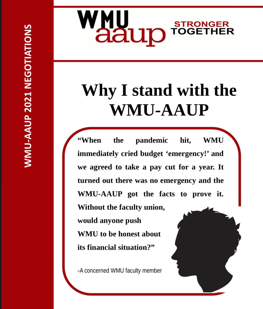 As a reminder of the WMU-AAUP’s position about this, please recall that, at an all-member WMU-AAUP meeting, faculty insisted that faculty, staff, and student voices should help determine pandemic safety steps, given their potential life and death impact on WMU, Kalamazoo and beyond. A full Chapter vote followed and the results couldn’t have been clearer: an overwhelming majority agreed that vaccinations should be required, and, further, that faculty should determine the best modality for their course offerings, and other work, during the pandemic.